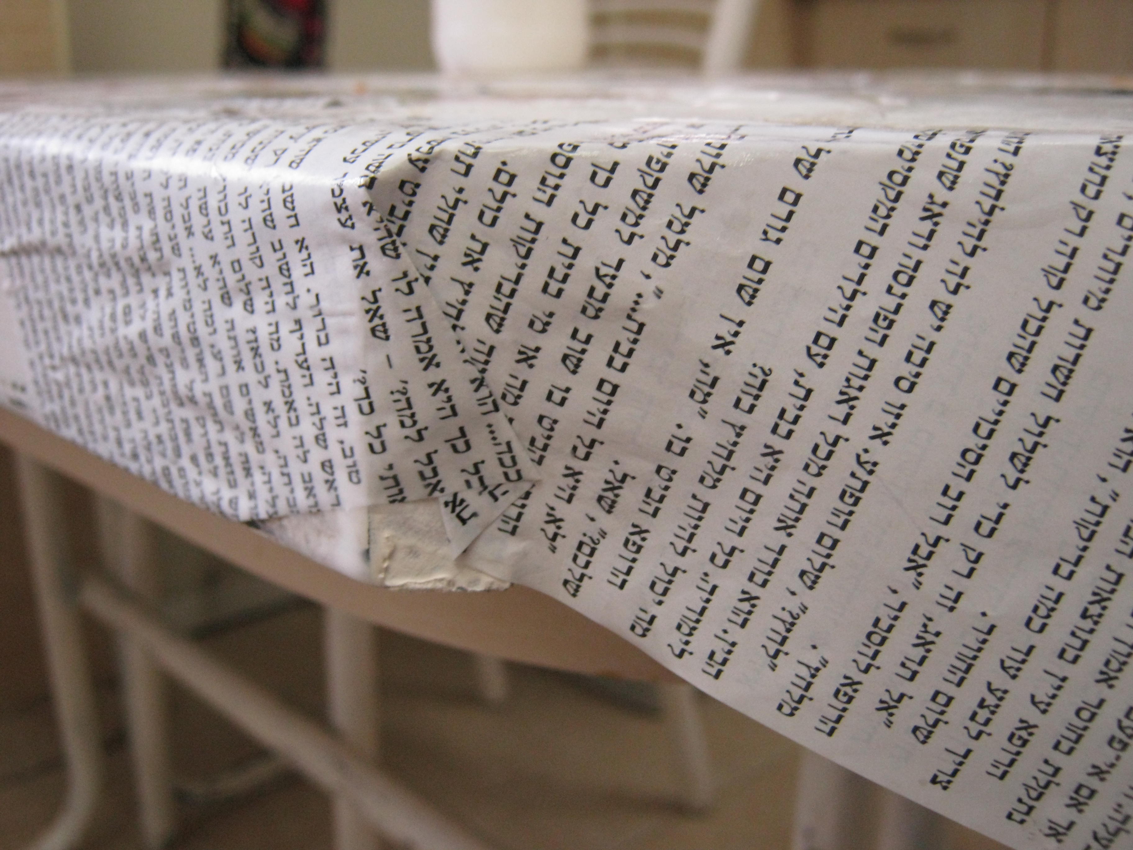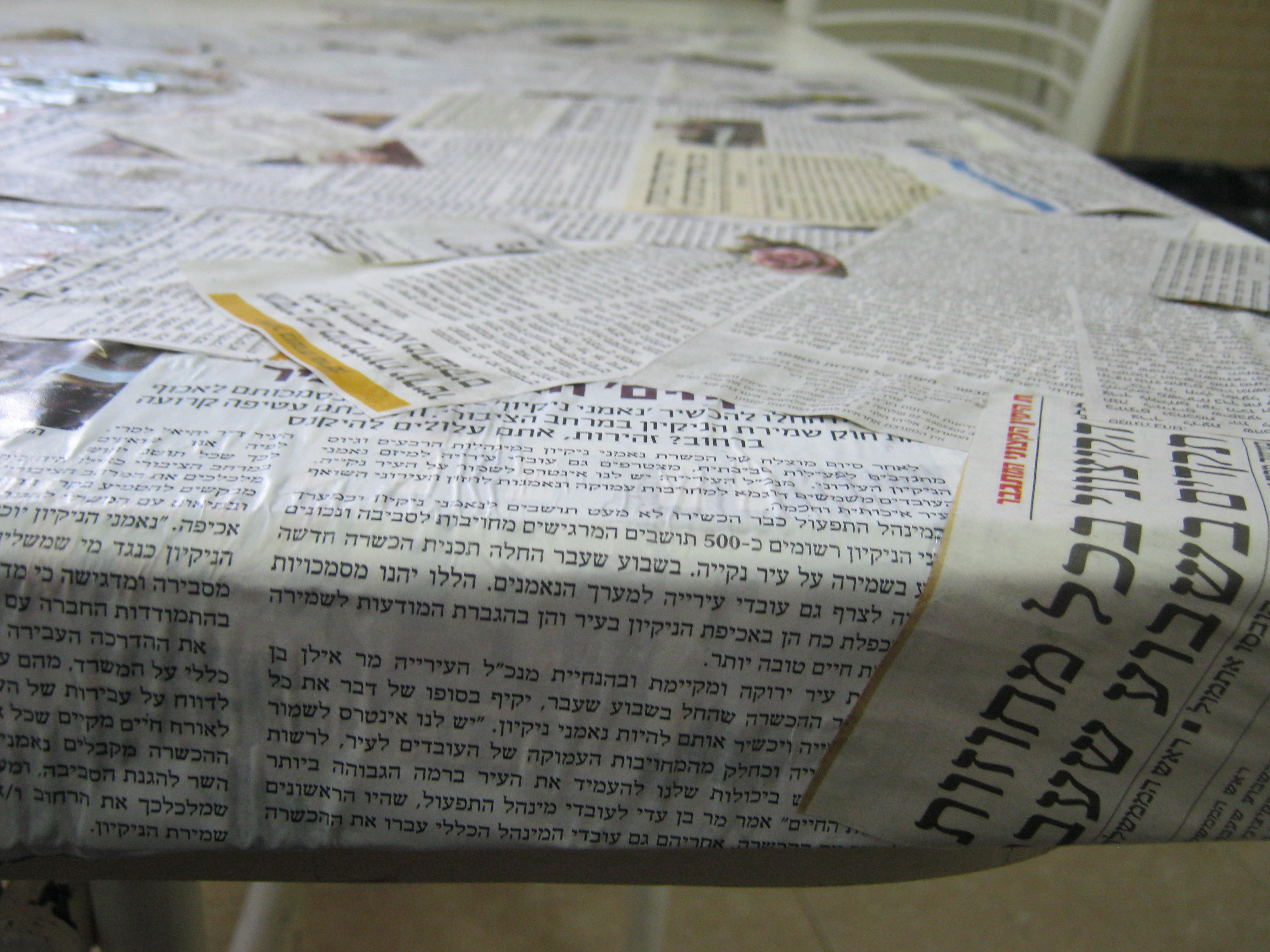 הנחתי את כל הכתבות והגזירים על השולחן לראות שיש לי מספיק גזירים שיכסו את כל שטח השולחן, לקחתי בחשבון גם את הגובה של השוליים, והתחלתי למרוח דבק, כל פיסת עיתון קיבלה יחס אישי וההדבקה הייתה ממש פרטנית, ולמה? חשוב שהדבק יהיה על כל הנייר כדי שלא ייווצרו לנו בועות אויר או קימוטים (קרה לי מעט לקראת הסוף)