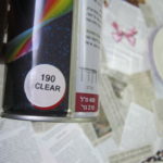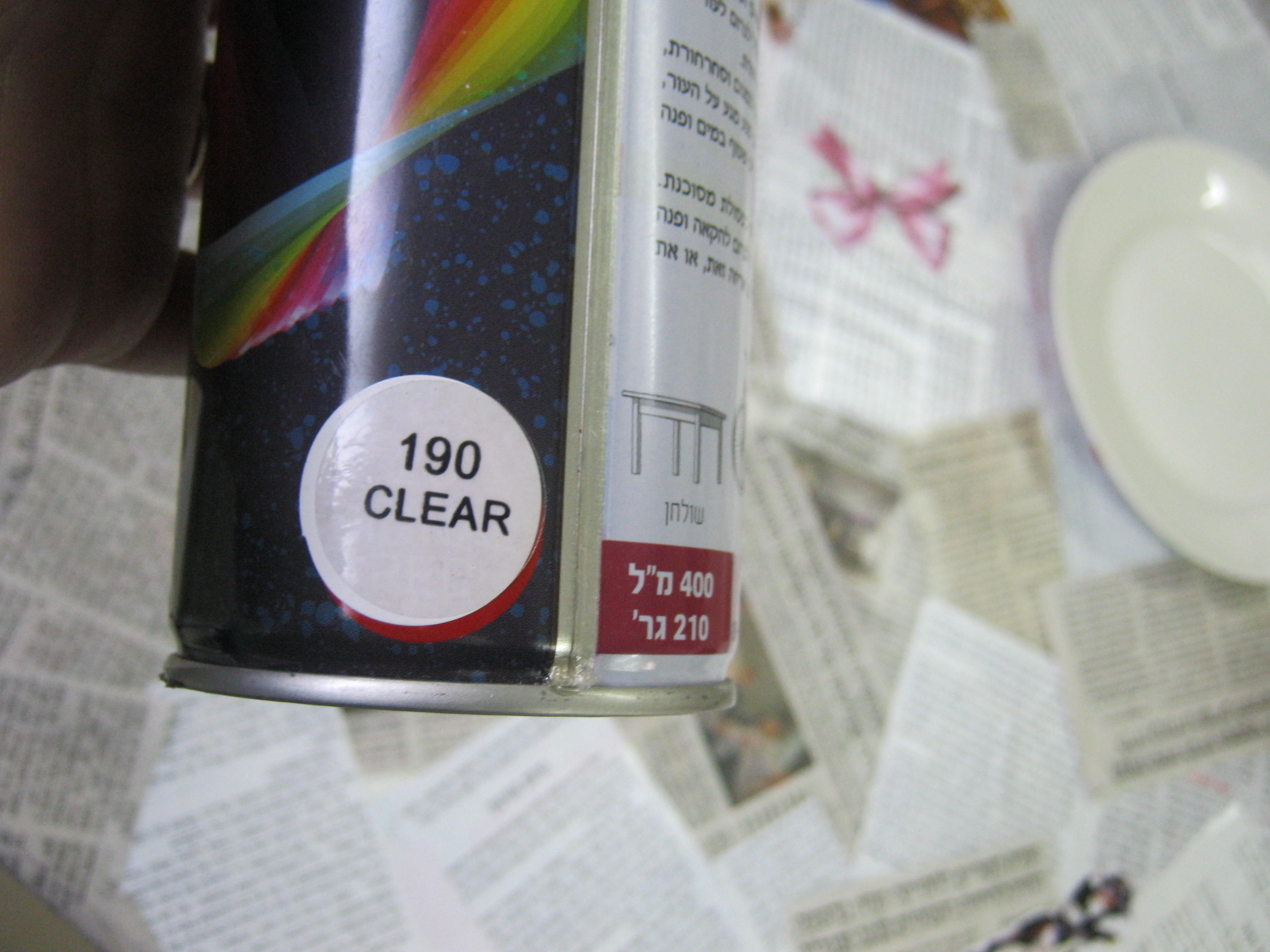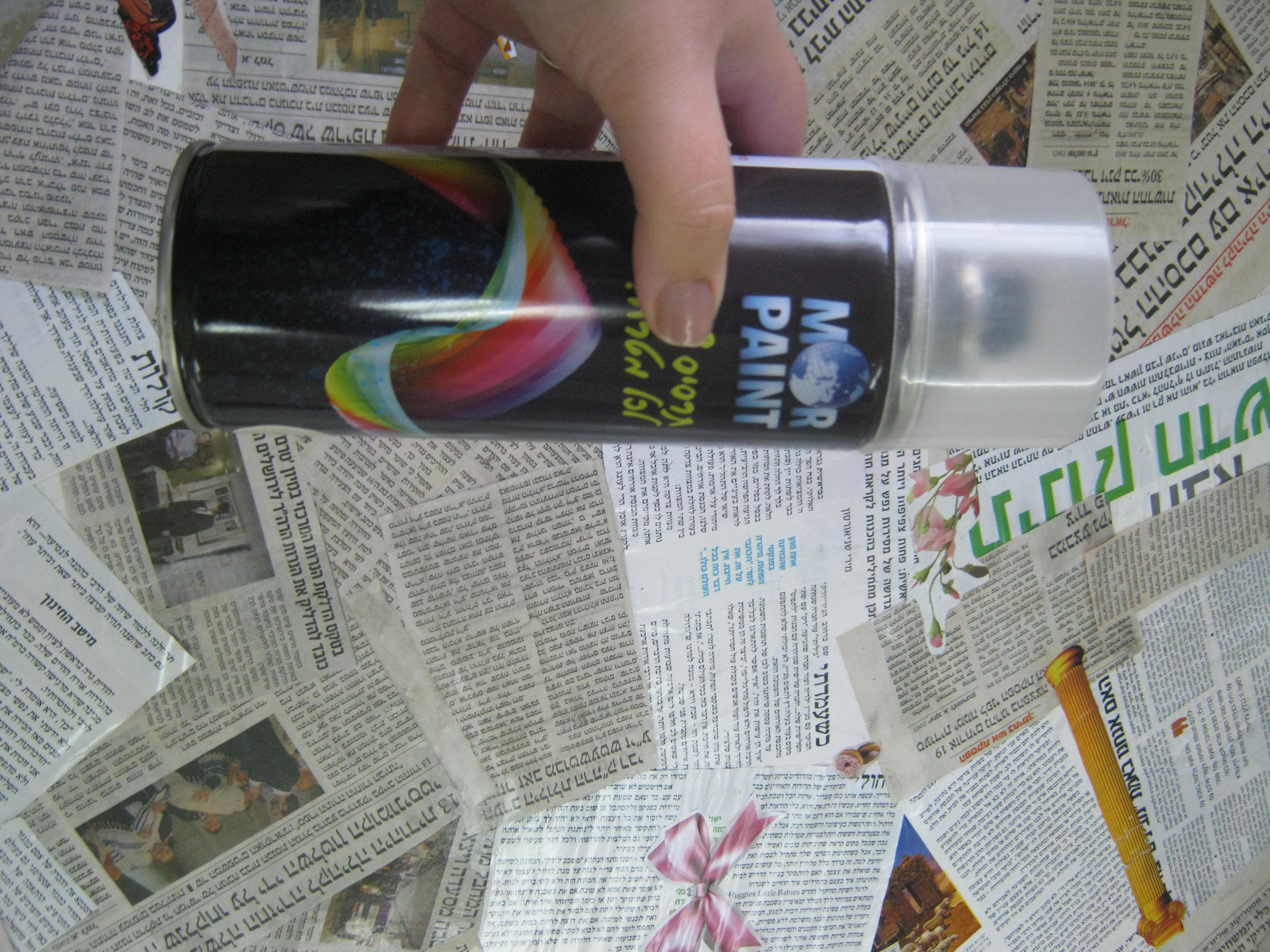 ספריי שקוף מסוג mor paint של היצרן Aiteli-r.o.c – ניתן לרכוש אותו בכל חנות טמבור וחנויות יצירה. בהשפרצה של 2 שכבות ספריי שקוף העיתונים מתקשים וניתן להעביר עליהם ניגוב כמו מגבון או שפריץ קליל של וינדולין (מנקה חלונות) אך שמנה לב לא לשפוך כמות נדיבה של מים בכל אופן מדובר בנייר מוקשה….