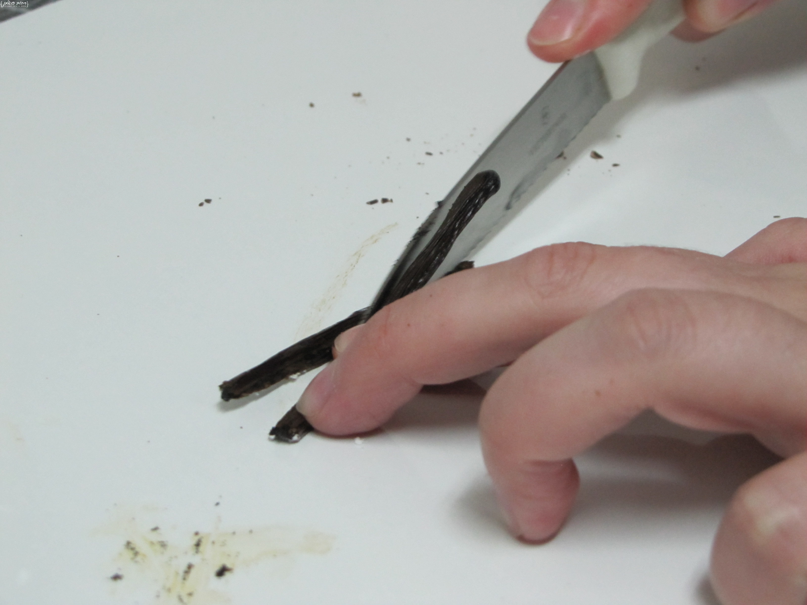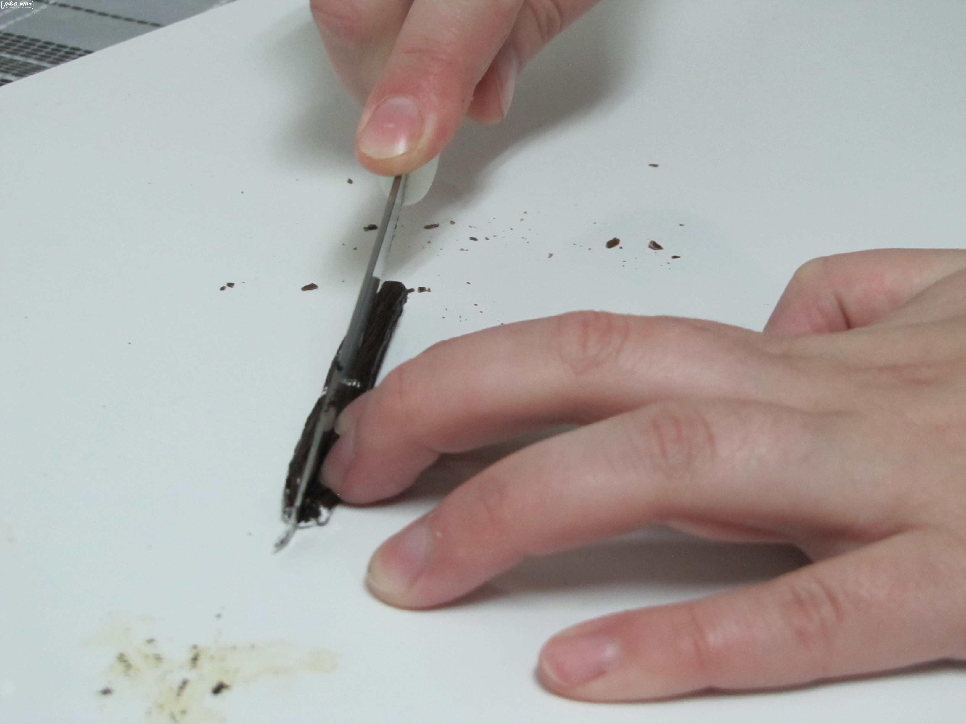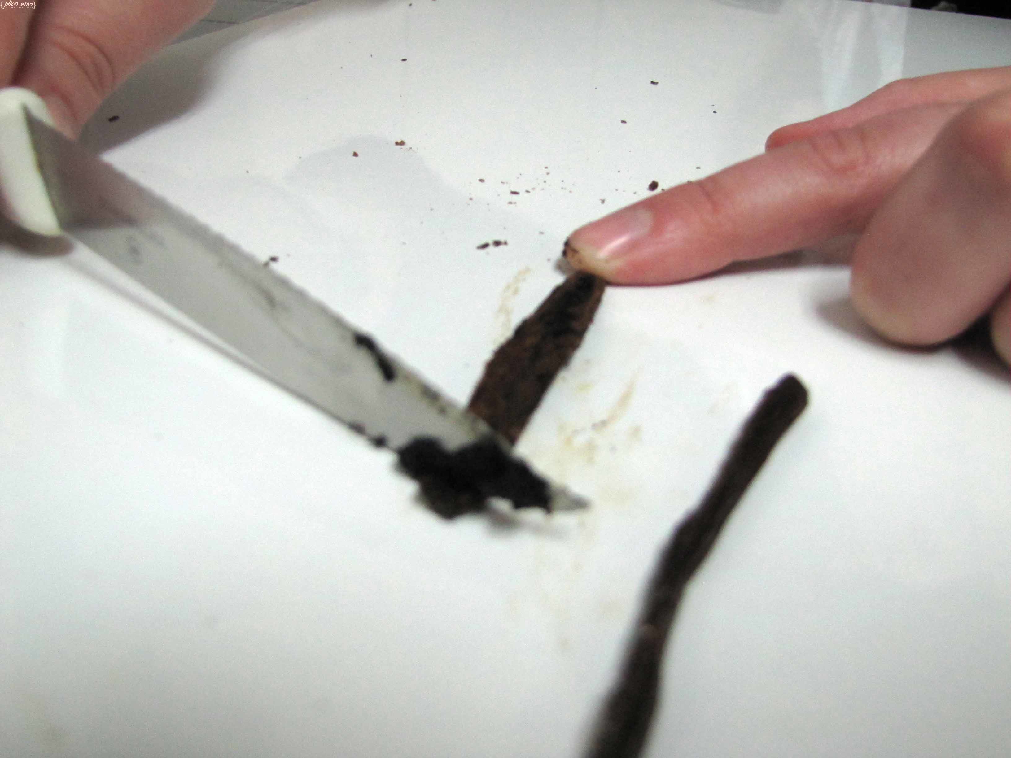 חוצים את המקל לרוחבו, בעזרת גב הסכין פותחים את תרמיל הוניל ומגרדים החוצה את הגרגירים,