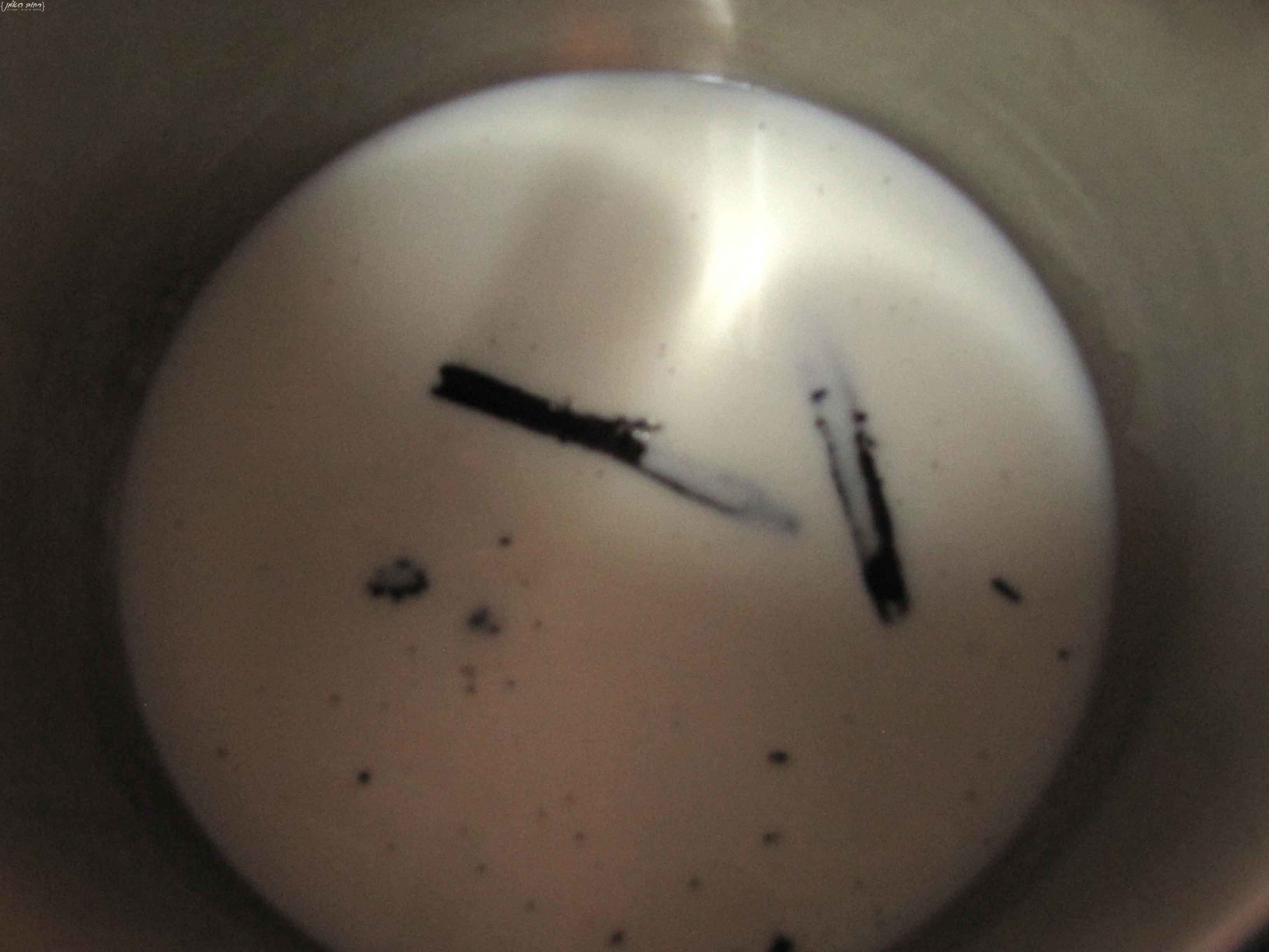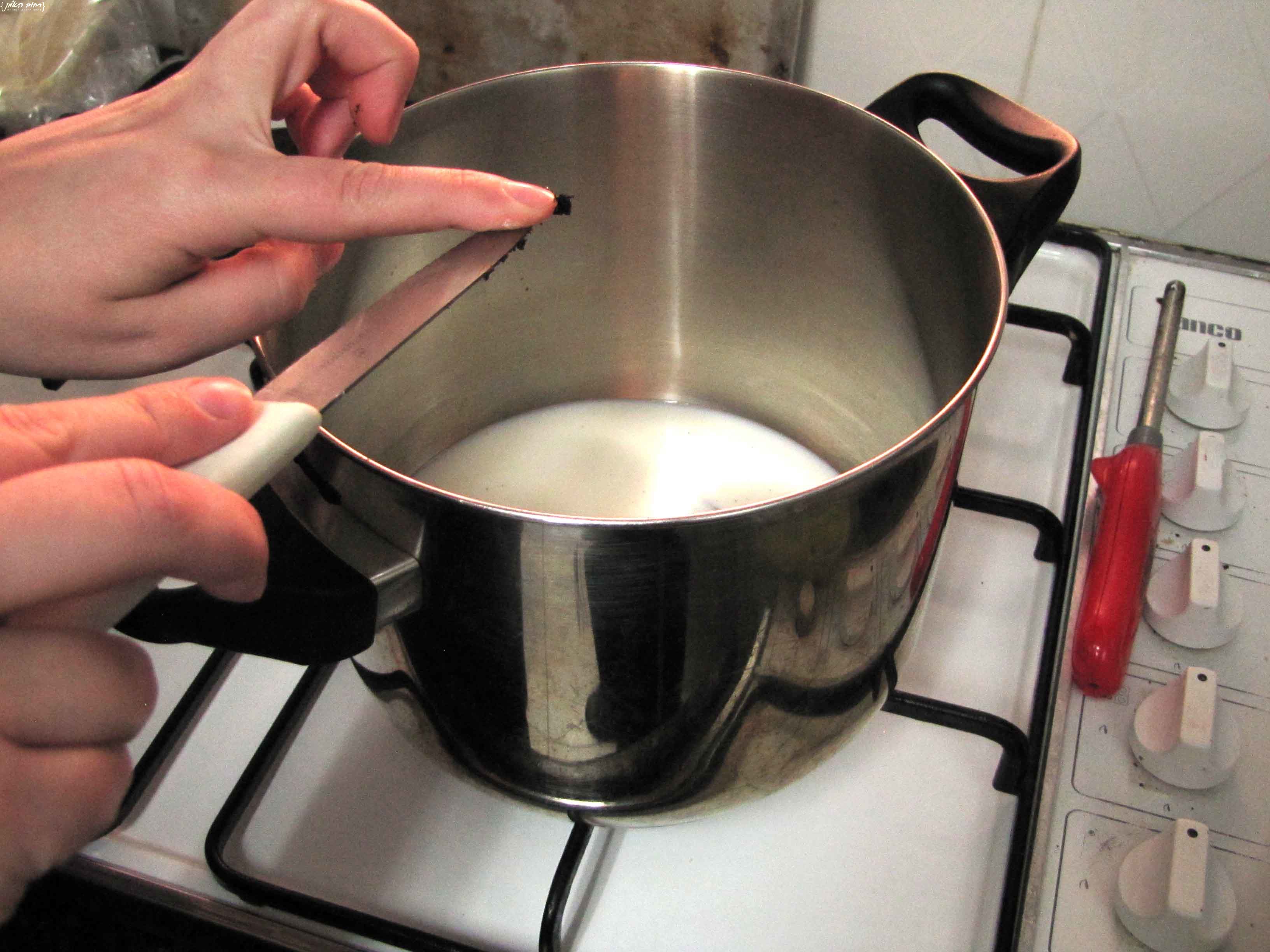 את הגרגירים מכניסים לנוזל הרצוי, במקרה שלנו החלב, וזורקים לתוכו גם את המקלות שיוסיפו לנו ארומה חזקה של וניל, לאחר השימוש ניתן לשטוף את המקלות ולשים בצנצנת עם סוכר, המקלות יתנו ריח וניל לסוכר, ויהיה לכם סוכר וניל (*יש לזכור שאם המקלות בושלו עם חלב, הם הופכים את הסוכר לחלבי*)
