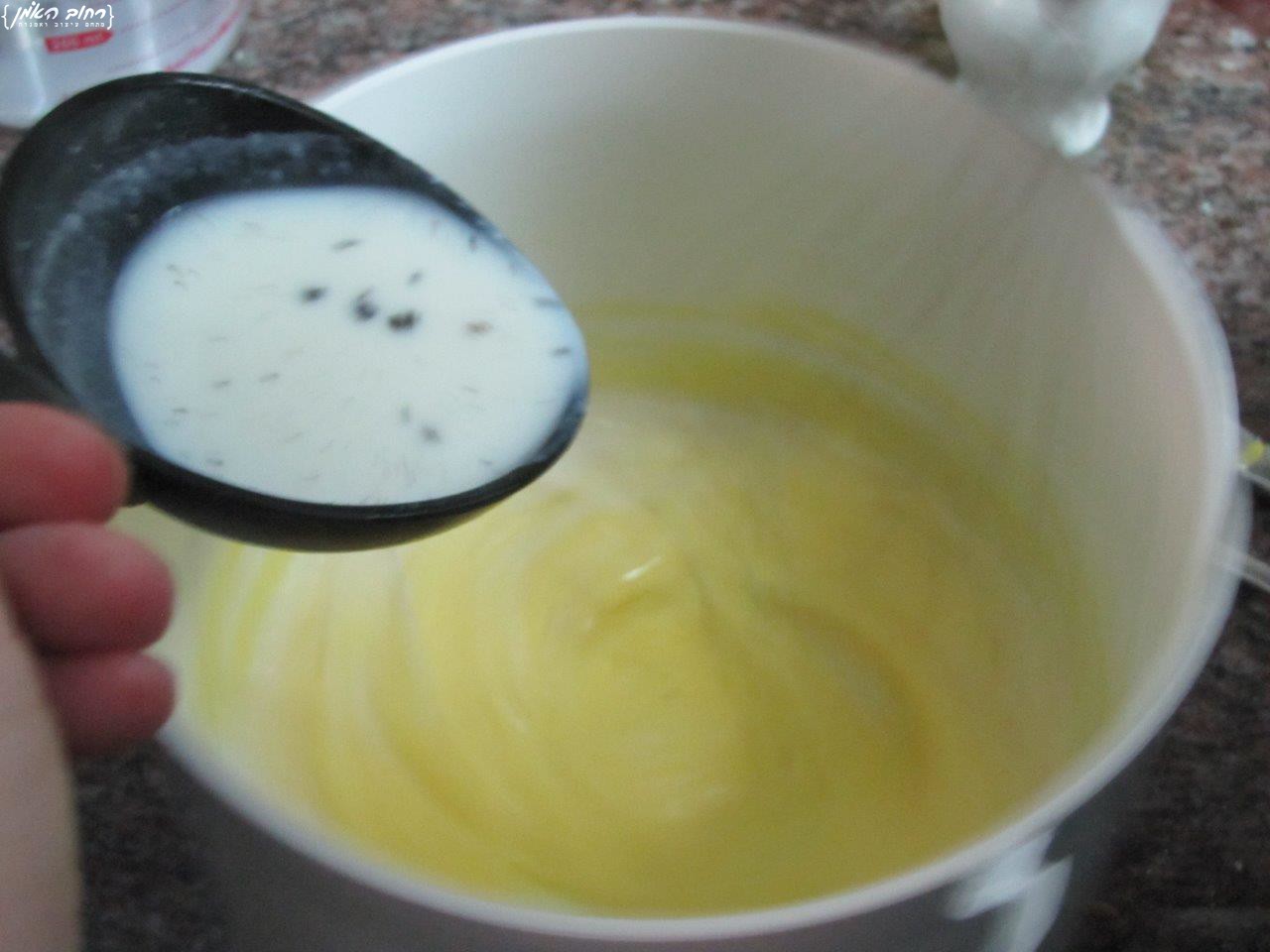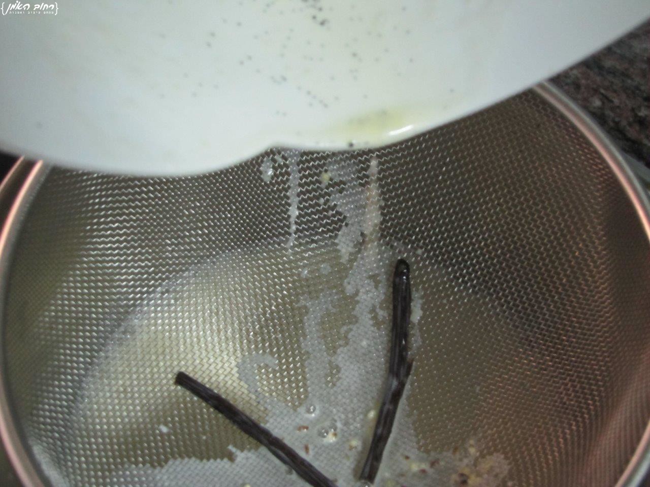 לאחר שהעברנו בזהירות את החלב לתערובת החלמונים, מערבבים טוב, ואוספים מדפנות הקערה חלמונים שלא עורבבו, ומעבירים חזרה לסיר, אבל! דרך מסננת, בדרך זו ניפטר מחתיכות ביצים שנקרשו וממקלות הוניל.