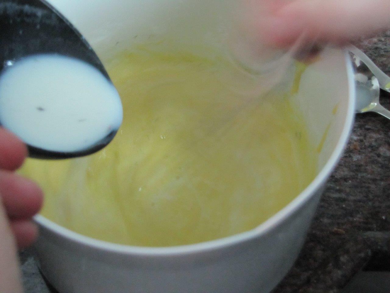כשהחלב מגיע לרתיחה מזרזפים בזרם דק את החלב הרותח לתוך תערובת החלמונים תוך ערבוב נמרץ, בשלב ההתחלתי עד שתתמקצעו כדי לבקש עזרת אדם נוסף שיחזיק את הקערה,