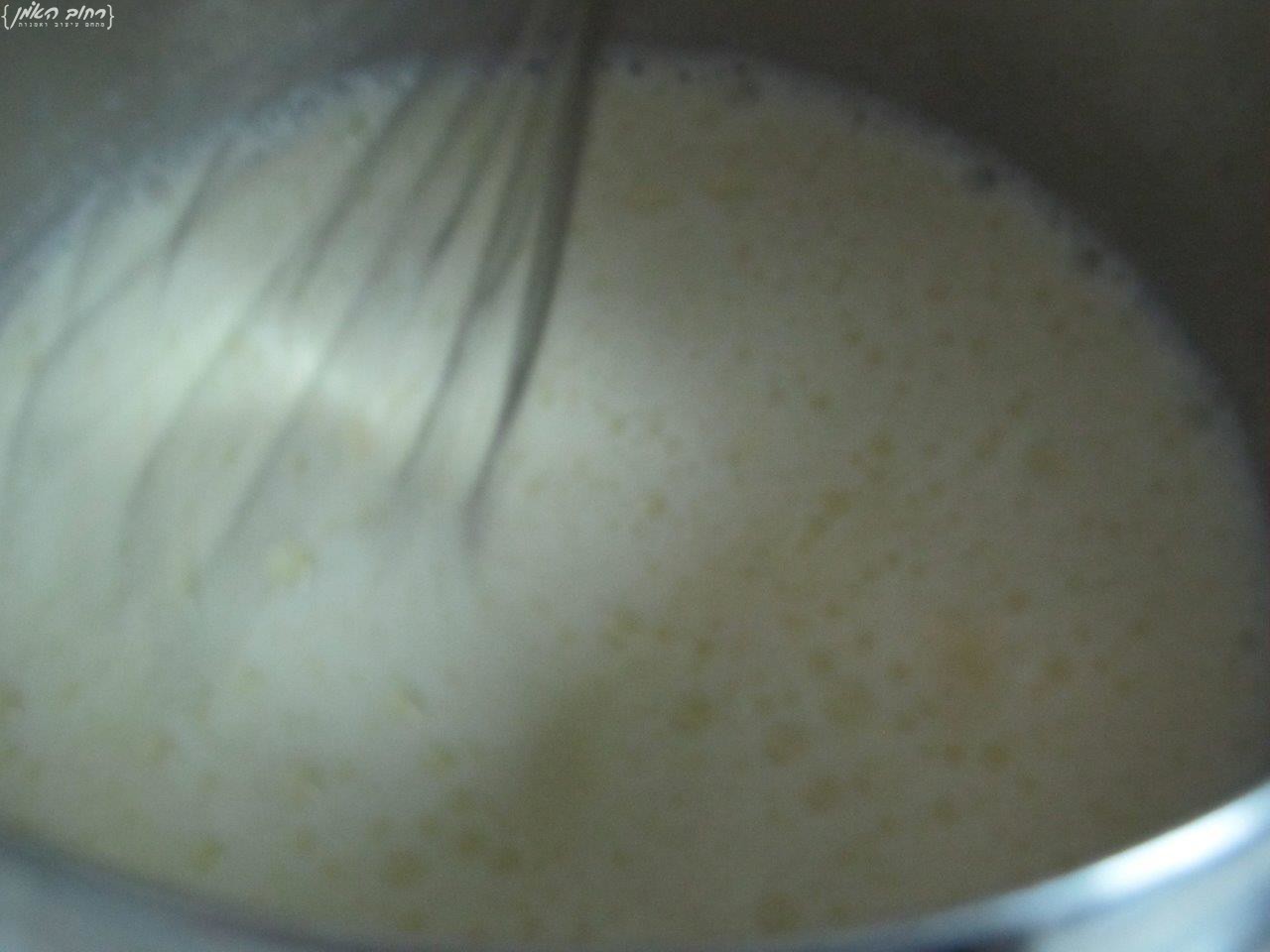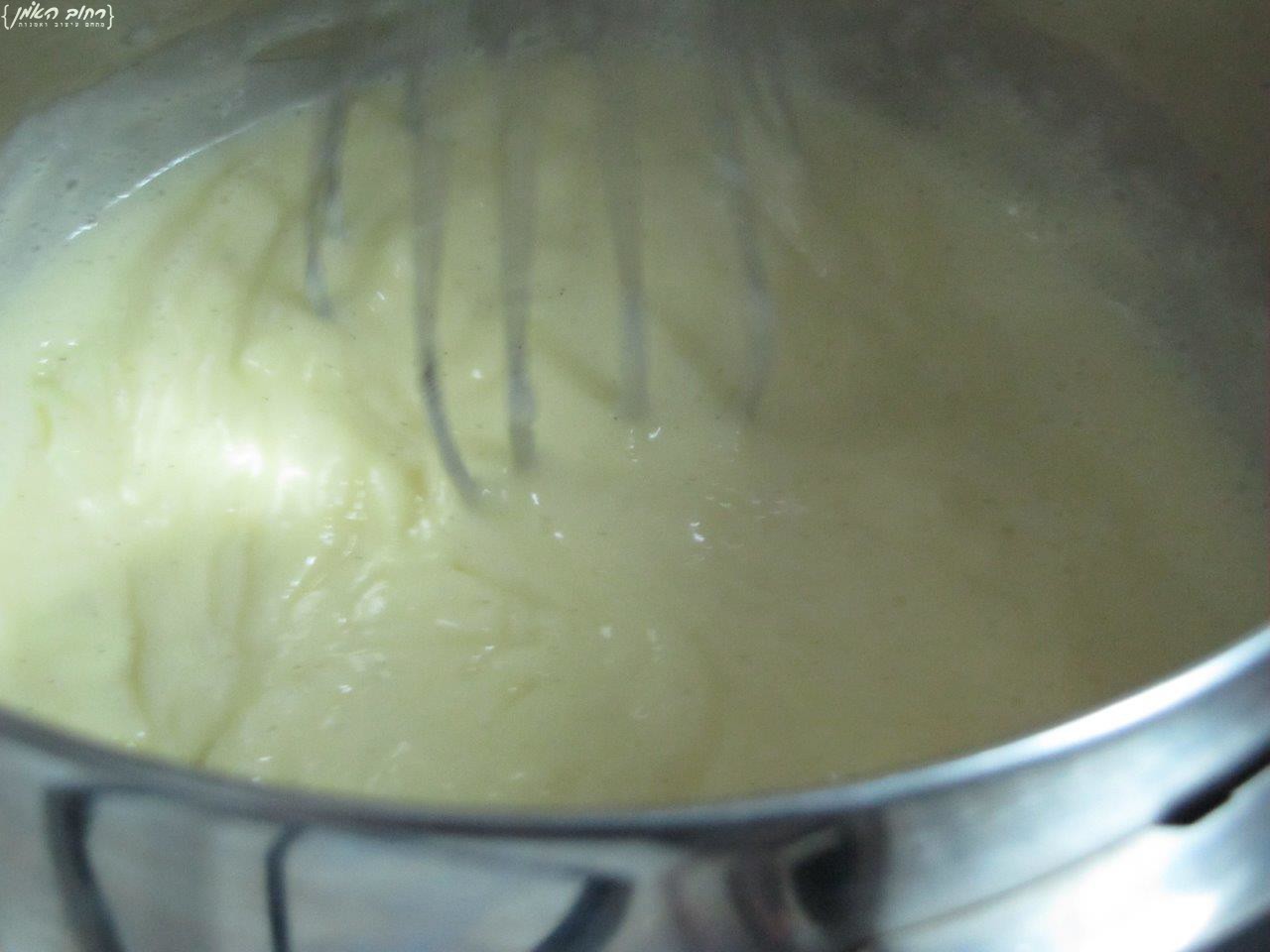 מערבבים בסיר את הקרם כל הזמן, לא להפסיק!!! עד שהקרם מתחיל להסמיך, ברגע שהקרם מעלה 3 בועות , מיד מעבירים לכלי אחר,