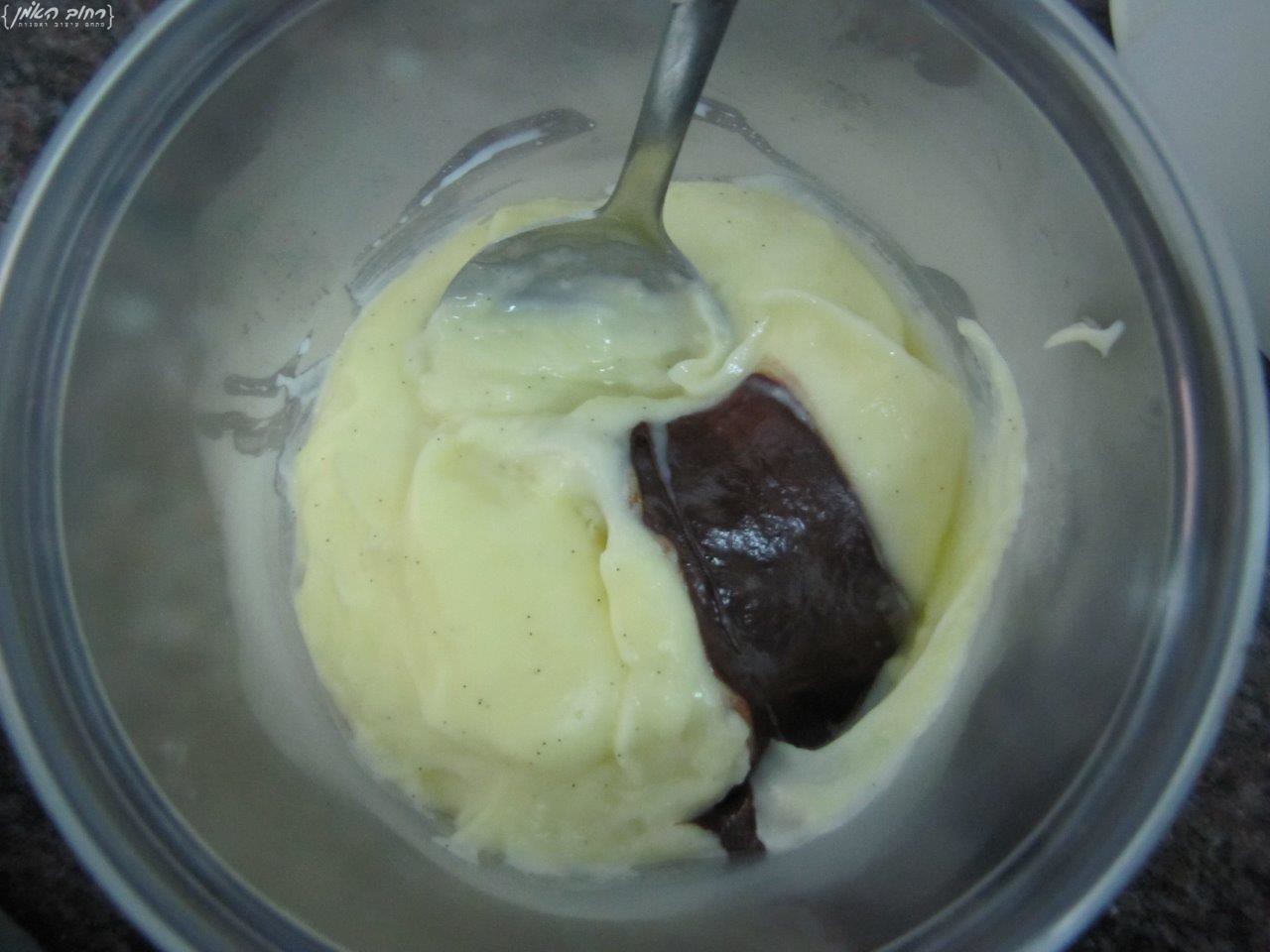 שוקולד- מכינים בקערה 90 גר' שוקולד שבור, ושופכים את הקרם מעל השוקולד, מחכים דקה, שתיים, ומערבבים עד להטמעת השוקולד, המלצתי היא להוריד את כמות הסוכר ל60 גר', ע"מ שלא יהיה מתוק יותר