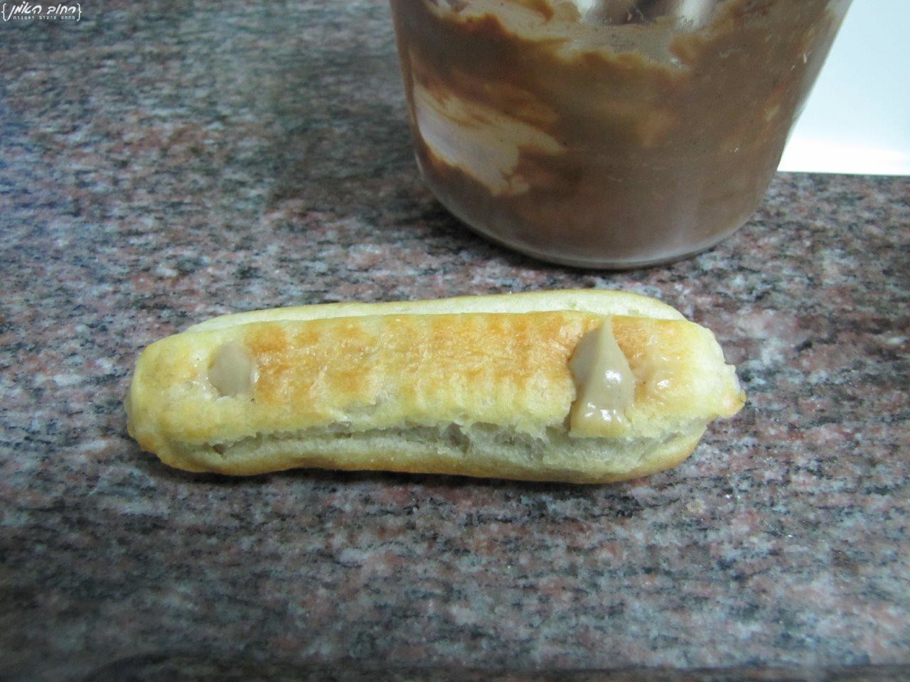 כמו שלמדנו בפוסט הפחזניות, מחוררים חור ב2 קצוות האקלר  וממלאים בקרם מ2 הצדדים, ככה נבטיח מילוי אחיד בכל האקלר,